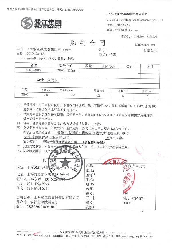 上海淞江減震器集團(tuán)有限公司介紹:天津蘭芳園食品香飄飄奶茶波紋補償器合同項目信息,淞江集團(tuán)為眾多食品企業(yè)提供衛(wèi)生級減震器產(chǎn)品,我廠食品級橡膠接頭通過國家質(zhì)檢部門通過并頒發(fā)檢測報告。