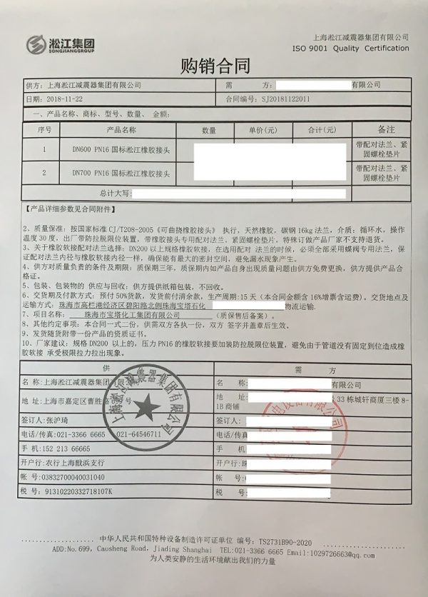 上海淞江減震器集團(tuán)有限公司為您介紹:珠海寶塔石化橡膠撓性接頭合同項(xiàng)目信息,淞江集團(tuán)為眾多石化企業(yè)提供優(yōu)質(zhì)橡膠接頭產(chǎn)品,以下是為珠海寶塔石化提供DN600、DN700橡膠接頭合同介紹。