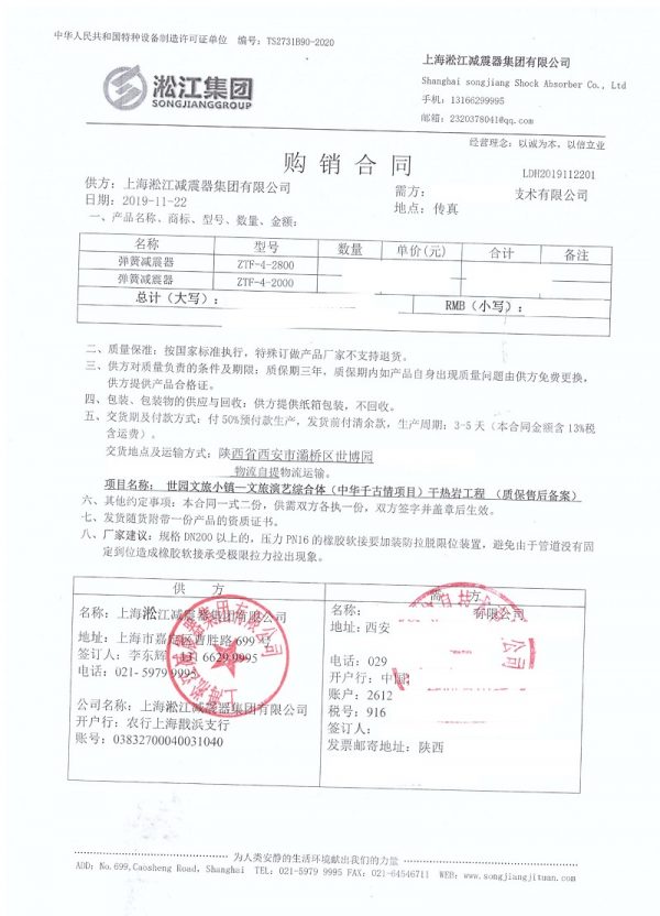 上海淞江減震器集團(tuán)有限公司介紹:西安世園文旅小鎮(zhèn)綜合體彈簧減震器合同信息,我們?yōu)槲靼驳貐^(qū)眾多綜合體項(xiàng)目配套彈簧減震器產(chǎn)品,主要用于冷水機(jī)組和變壓器減震降噪。