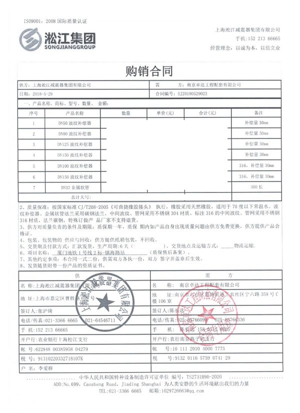 上海淞江減震器集團(tuán)有限公司為您介紹:廈門(mén)地鐵1號(hào)線二標(biāo)段橡膠伸縮節(jié)合同項(xiàng)目信息,淞江集團(tuán)為眾多城市地鐵項(xiàng)目提*管道減震器產(chǎn)品,包括橡膠接頭、波紋補(bǔ)償器、金屬軟管、彈簧減震器等產(chǎn)品,以下是淞江集團(tuán)為項(xiàng)目地鐵1號(hào)線二標(biāo)段提*橡膠接頭、波紋補(bǔ)償器介紹。