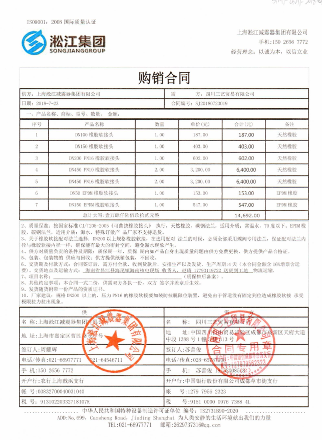 上海淞江減震器集團有限公司為您介紹:海南省昌江縣海尾鎮(zhèn)核電橡膠軟接頭項目,淞江集團銷售在2018年7月23日簽下該合同,為海南省昌江縣核電項目提供橡膠軟接頭產(chǎn)品,型號均為:DN100,DN150,DN200,DN450,DN50等,詳細產(chǎn)品下面介紹。