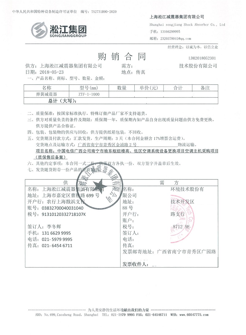淞江集團(tuán)為該項(xiàng)目提供的是ZTF型彈簧減震器,型號(hào)為ZTF-1-1000等,質(zhì)保期一年,主要作用是減振和降噪的作用,淞江集團(tuán)為國(guó)內(nèi)眾多電信公司提供彈簧減震器產(chǎn)品,我們還生產(chǎn)橡膠軟接頭,波紋補(bǔ)償器,金屬軟管等系列減振產(chǎn)品。