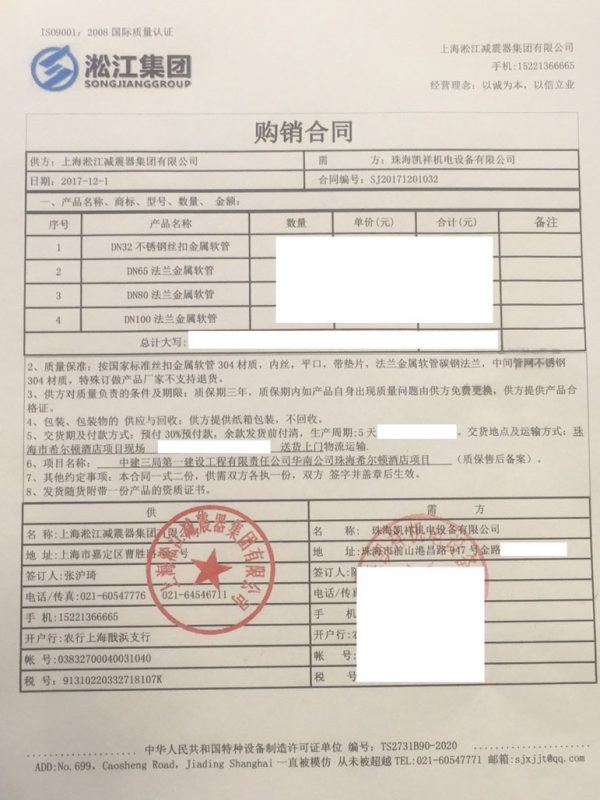 淞江集團為該項目提供的是法蘭金屬軟管產(chǎn)品,型號為DN65、DN80、DN100等,絲扣金屬軟管為DN32型號,產(chǎn)品要求:內(nèi)絲,平口,帶墊片;法蘭金屬軟管為碳鋼法蘭,中間管網(wǎng)不銹鋼304材質(zhì),特殊定制產(chǎn)品廠家不支持退貨,質(zhì)保期為三年。淞江集團為國內(nèi)眾多酒店項目提供法蘭金屬軟管產(chǎn)品,我們還生產(chǎn)橡膠軟接頭,彈簧減震器,波紋補償器等減震系列產(chǎn)品。